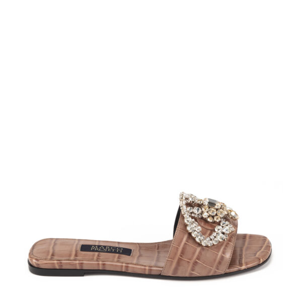 Flat sandals and slippers in croco-embossed brilliant nuance leather, embellished by the new Orchid jewel.