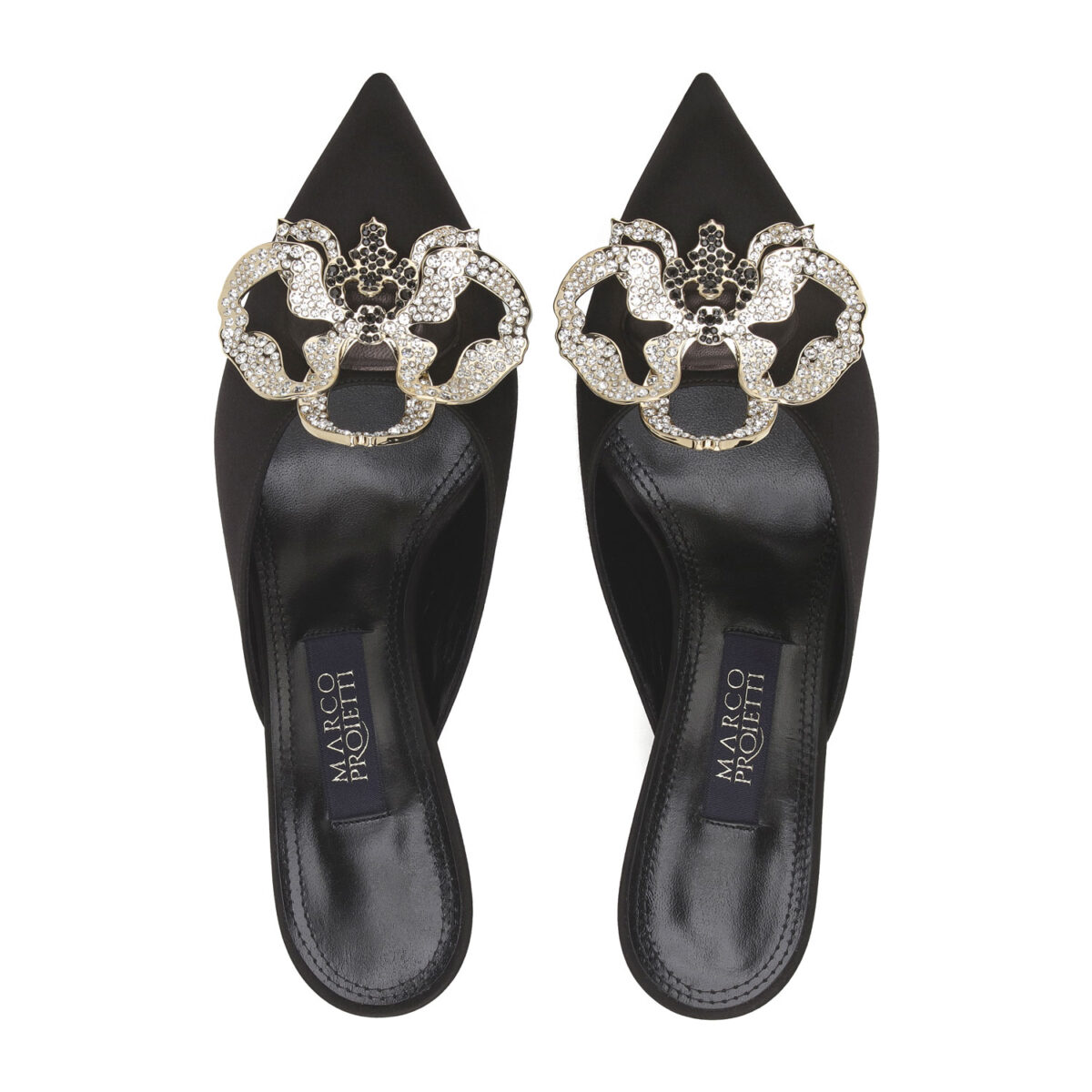 Feminine, magnetic and voluptuous, this creation is crafted in silk satin in precious and luxury tones of black. It’s injected with regal feel and become protagonist with the sophisticated and iconic orchid jewel detail. The perfect balance between elegance and glamour.