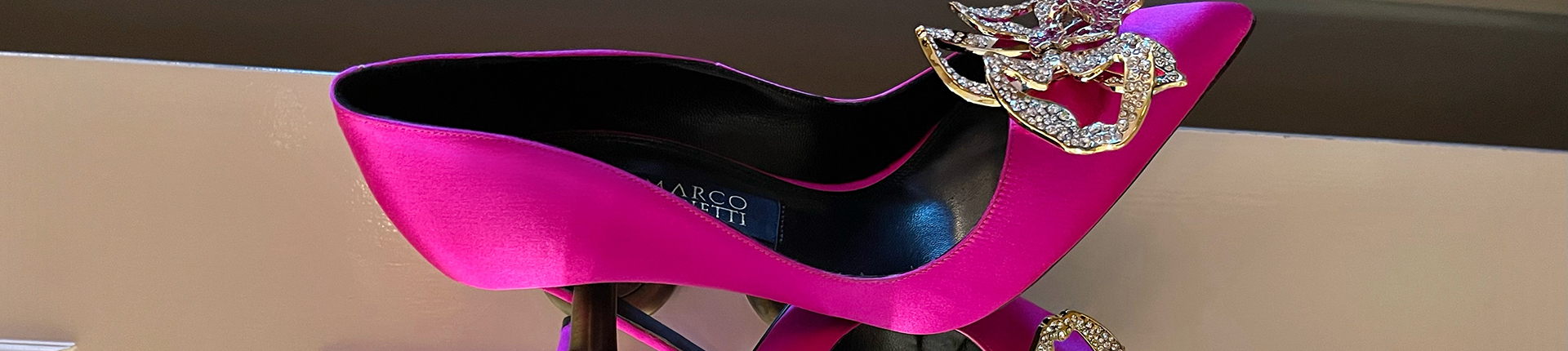 Le iconiche décolleté Orchid in prezioso raso o brillante stampa coccoe le décolleté open in cristalli Swarovski.